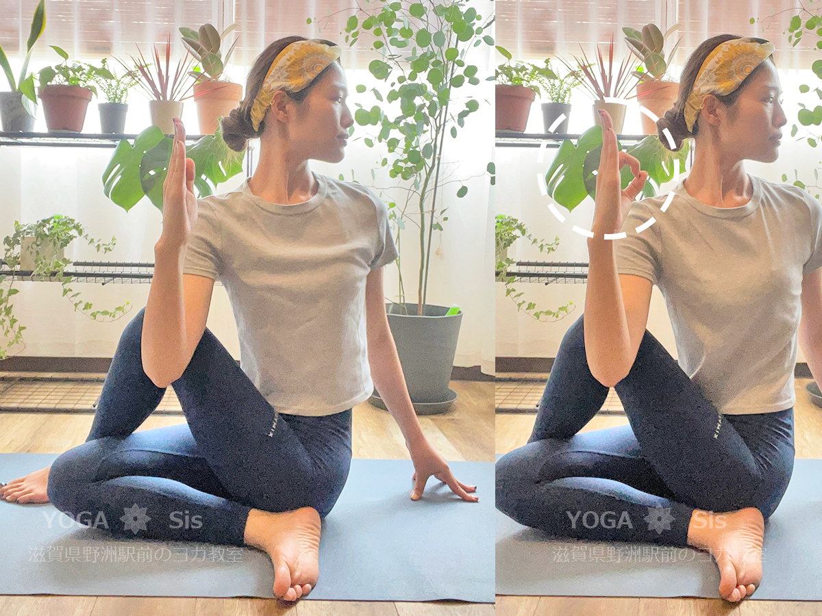 - 更にねじりが深められそうであれば、右肘を左膝の外に出します。